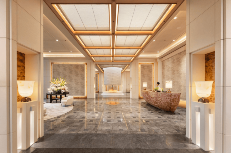实景中,地面常采用 天然石材的拼花工艺,不同色调的石材精准对缝,形成简洁而富有层次的几何图案,彰显低调的仪式感。