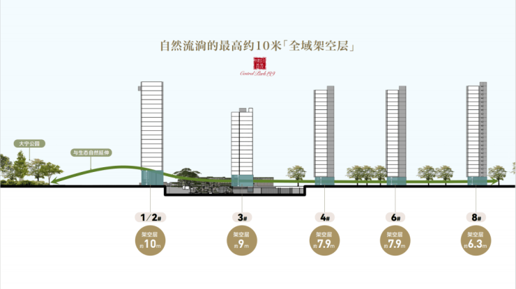 向内,项目更是以令人惊叹的魄力,打造了 约6.3-10米超高层级全域架空 设计。