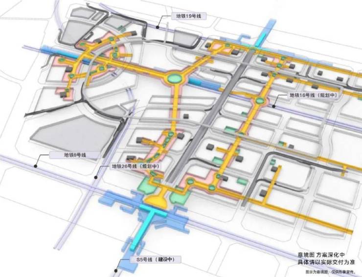 △高效互联:地下三层布局【19号线:双机场空港线】、【6号线:主城新区联系线】、【16号线主城新区联系线(规划中)】、【26号线:新区环线(规划中)】、【S5线:成都都市圈眉山线(建设中)】,共5条轨道线路与4大站点系统。同时设置大型城市候机楼,由轨道编织的城市未来新中心枢纽正在逐步形成。