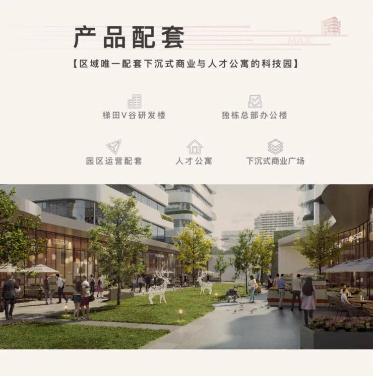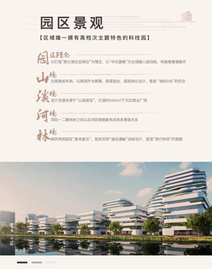 MAX科技园,总占地6.6万平方米,总建面21.5万平方米,以“美兰湖生态绿谷”为设计理念,打造花园式总部企业办公,园区