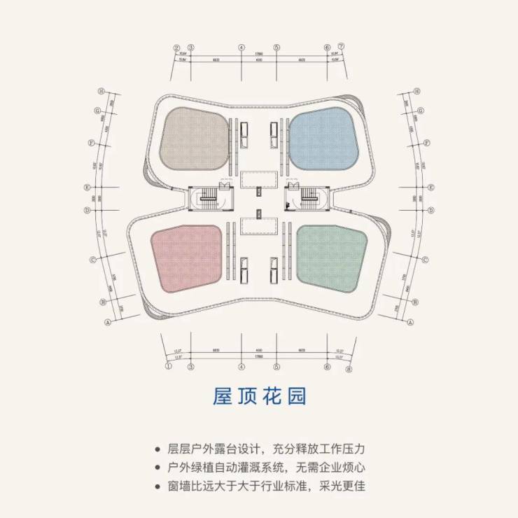 毛坯交付,每栋独栋均配备独立电梯(客梯),并可独立冠名,彰显企业尊贵身份。每层270度环形采光和露台花园,以及顶楼的楼顶花园,为企业提供了一个亲近自然、放松身心的绝佳场所。