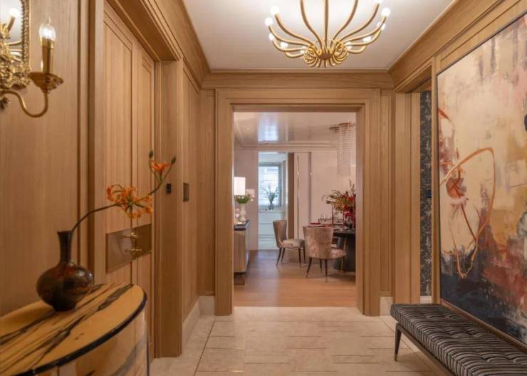 硬装上以木饰面和米色石材做结合,物料原始肌理感,表达经历时间后的沧桑痕迹。大理石地面镶嵌精致金属条,保留材质的原始感,木饰面配柔和灯光,调和出安宁澄澈的归家氛围。