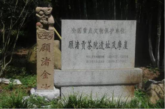 顾渚山摩崖石刻海拔 310米 ,和附近的山岭连在一起 ,形成一座太师椅的屏障。顾渚山对唐代茶文化具有重要的佐证价值。目前 ,贡茶院院址已成为历史遗迹。关于茶事 ,除了留下详尽的文献资料以外 ,颇为可靠的记证就是在顾渚山一带的摩崖石刻。至今尚存的石刻 ,共有三组八处之多。这些珍贵的石刻 ,从时间到内容 ,都和唐代贡茶有关。其中较集中的地方要数顾渚山以东 10里的金山村西侧约2 0米的白羊山的一组石刻 ,面积约 4平方米。