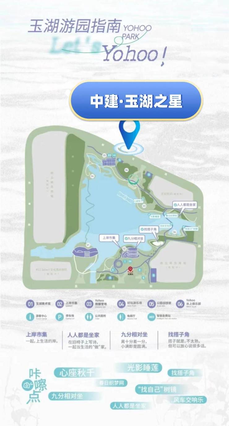 目前已开放的为玉湖一期、二期,拥有美术馆、上岸市集、湖畔营地、大草坪、音乐喷泉、儿童游乐场、水上运动俱乐部、创意艺术装置等多样化建筑与业态场景,满足周边群众的多样化使用需求。