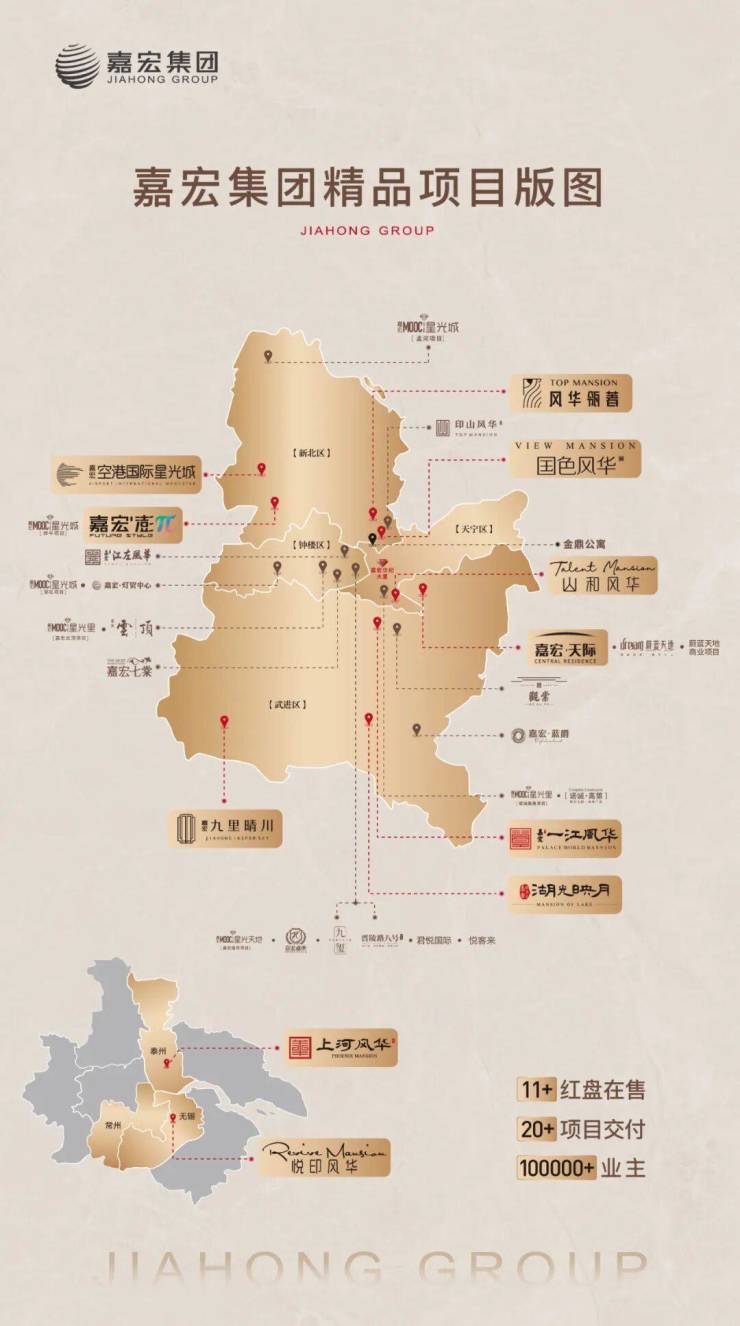 江苏嘉宏投资集团始创于1998年,25载砥砺前行,深耕长三角,业务涵盖地产/商业/物业/酒店/金融五大板块;累计开发面积近1000万方。连续15年获五星企业荣誉,具有一级开发资质,连续四年获市重大贡献奖;一江风华为嘉宏集团TOP级产品系。