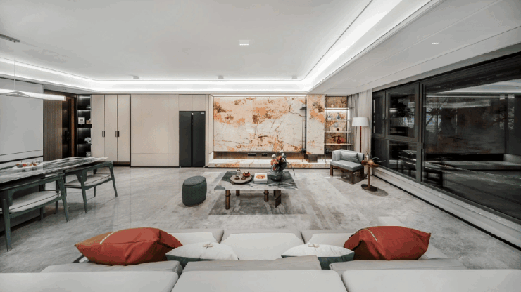 得益于充足的层高,即便安装了高低错落、起伏有致的帷幔吊顶,依旧显得宽敞气派。墙面装饰采用仿玉石岩板,并辅以金属线条,散发出一种格外柔和而高雅的光泽。