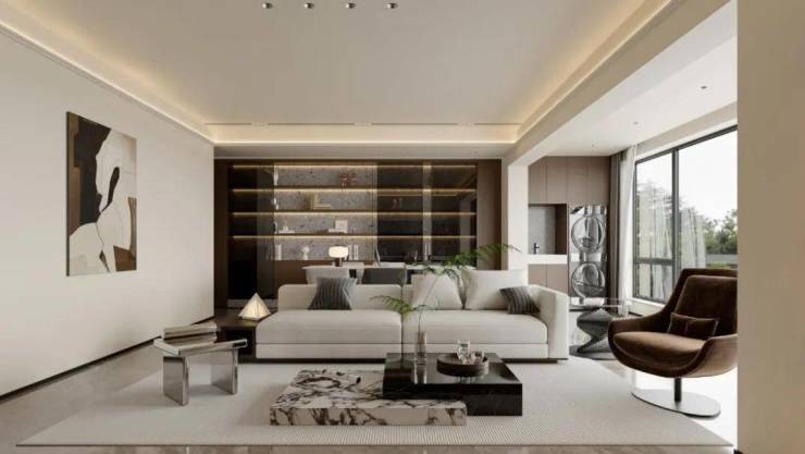 空间布局上,设计师大胆采用简洁线条与金属元素的巧妙结合,营造出一种既现代又不失温度的氛围感。金属光泽在灯光的映照下熠熠生辉,为整个空间增添了几分未来感与高级感,同时也不失温馨与亲切。这种恰到好处的平衡,正是现代轻奢风格独有的魅力所在。