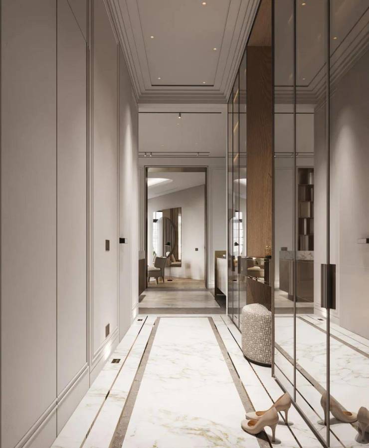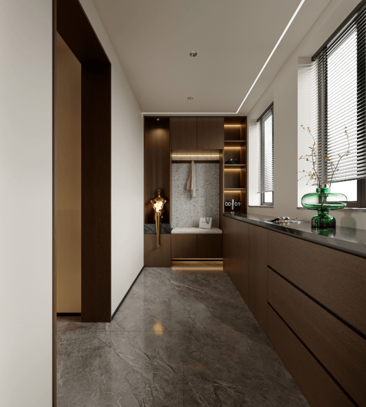 入户玄关轻奢利落,暖色调灯光配合木质纹理,温馨柔和。现代风的时尚与暖色调的温馨浑然天成,让人一进门就能感受到家的温暖。