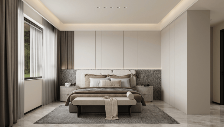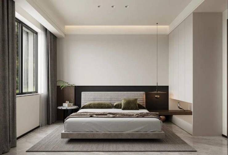 主卧空间营造出内敛沉稳的气质,米灰色和咖色的搭配,让空间更有层次,宁静中体会艺术气息,可以迅速进入梦想。阳光通过玻璃窗轻柔地铺洒在主卧,为整个空间注入了一份宁静与雅致。