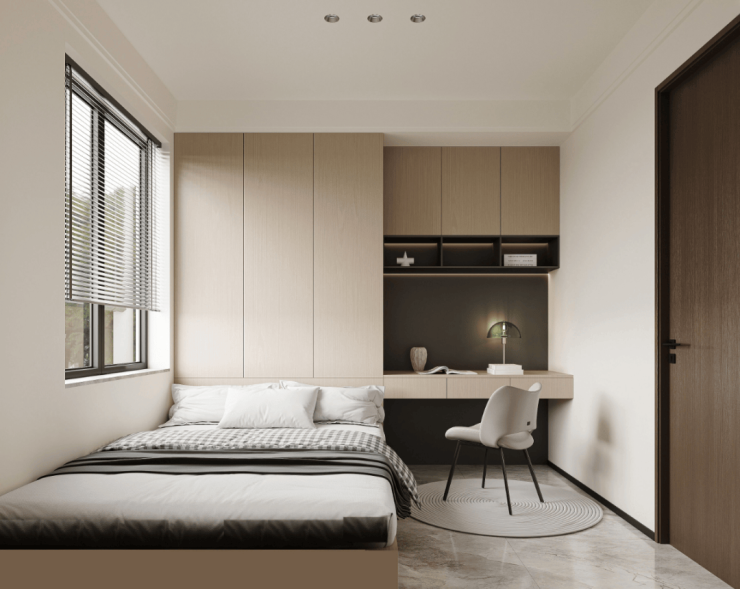 在那少女的小天地里,每一寸空间都被细腻的浅咖色温柔包裹,它宛如晨曦中一抹淡淡的暖意,与纯朴自然的原木色交织出一幅温馨的画面,简约而不失风情,轻轻触动着人心最柔软的部分。衣柜的设计独具匠心,圆润的柜门如同童话里的小窗,悄然开启一段关于成长的奇妙旅程,为这方小世界增添了几分童真与趣味。