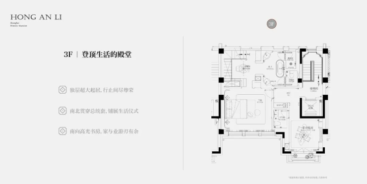 客厅互通,彰显家族生活的轩阔厅堂,2F家庭层,儿女的幸福与陪伴皆在左右,3F总裁套房式Penthouse,用具象的尺度描写人生成就的高度。