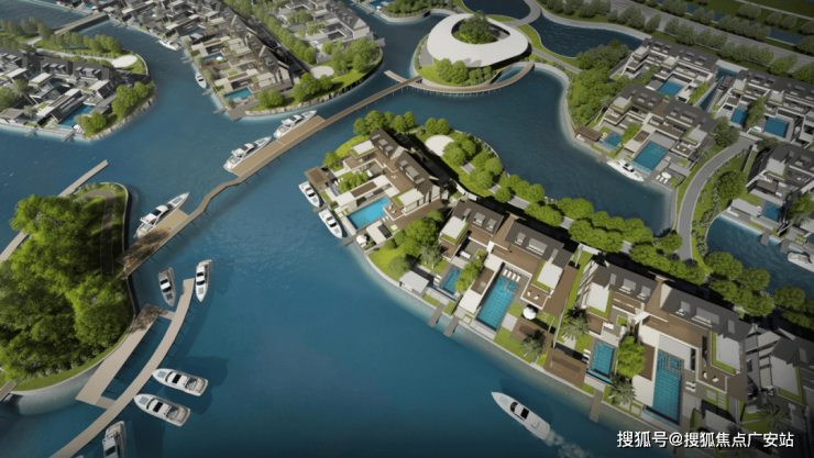 每一排别墅前都有一条渠道,引入水系,每户都带有水岸码头,用来停靠游艇,并且水系的分布确保每家都能开游艇到兰香湖中心,周末逛街shaopping,下了游艇到家再游个泳,不用出国就能享受棕榈岛同款生活。