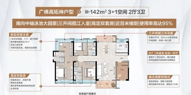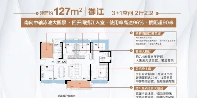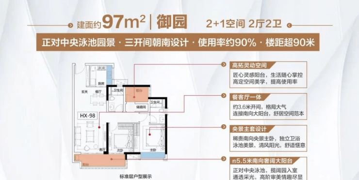 1:户型各方面比较不错,使用率蕞高可以去到百分之94。103以上的四房基本都能望到江景,97的市场上很常见的护型。