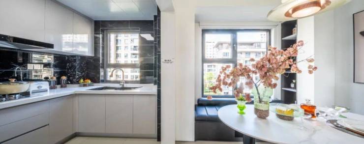 让餐厅成为家庭聚会的中心。这种开放式的设计不仅增加了空间的流动性,而且促进了家庭成员之间的互动。黑色的飘窗柜与白墙的经典色搭配,以及侧柜发光亚克力隔板,进一步加强了餐厅空间的设计感和氛围感。