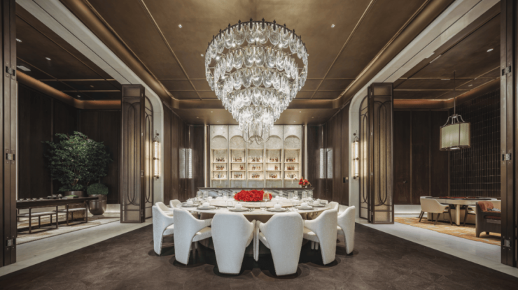 奢享私宴厅,内设巨形艺术水晶吊灯, 还有由整块香格里拉绿奢石一体打磨而成的吧台、白水晶奢石酒架、全景开放式落地窗……优雅格调跃然呈现。女王茶室可对外全部打开,宛若置身绿意和流水中,是闺蜜品茗小憩、私密洽谈的理想私属领地。