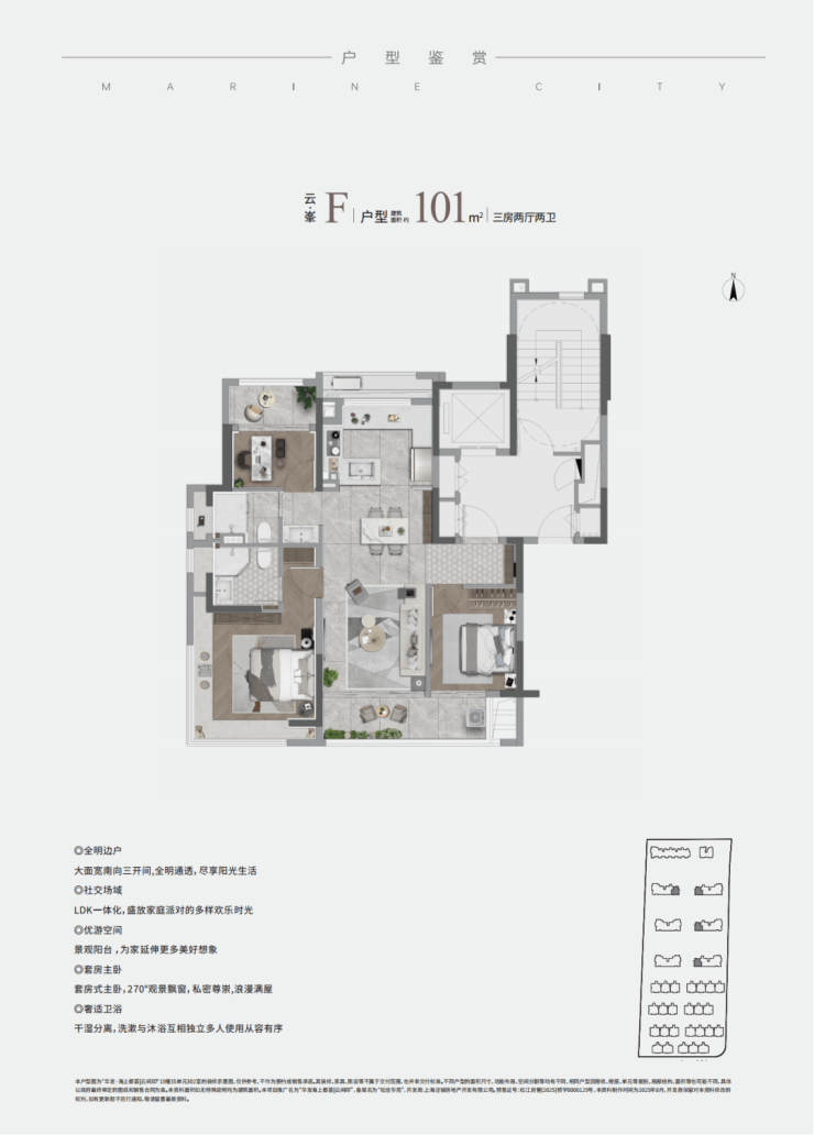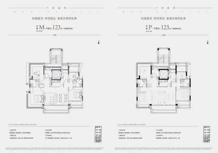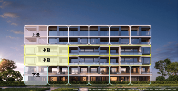 而中叠(建面约123㎡)则集便利与尺度于一身:不仅配备独立电梯厅,更以约13.4米南向面宽、约6米宽厅及南北双270°转角飘窗,营造出宽幕视野与通透空间,体感媲美整层大平层,实得率几近“满格”。