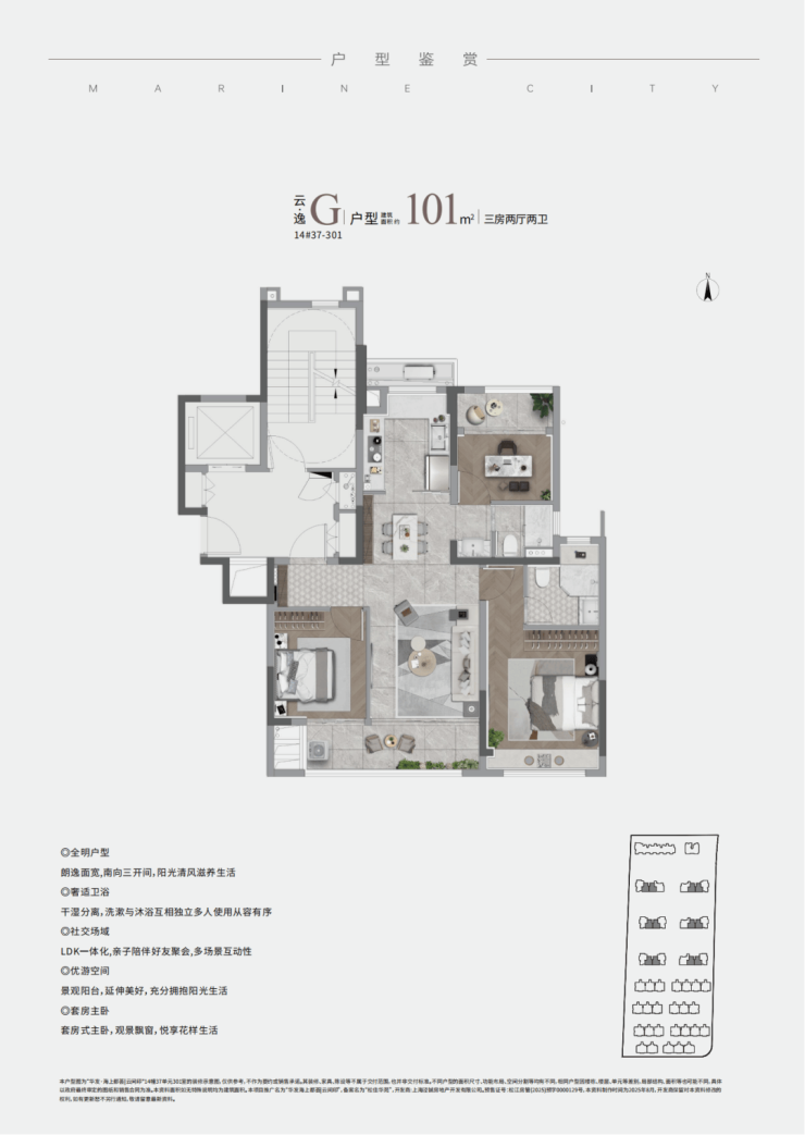 项目建面约101㎡的南厅边套户型,阳台面积接近12㎡,还有超过8㎡的飘窗,再加上设备平台等面积,房间的实得率比起松江目前在售待售的所有项目都要高!这不是绝版是什么?