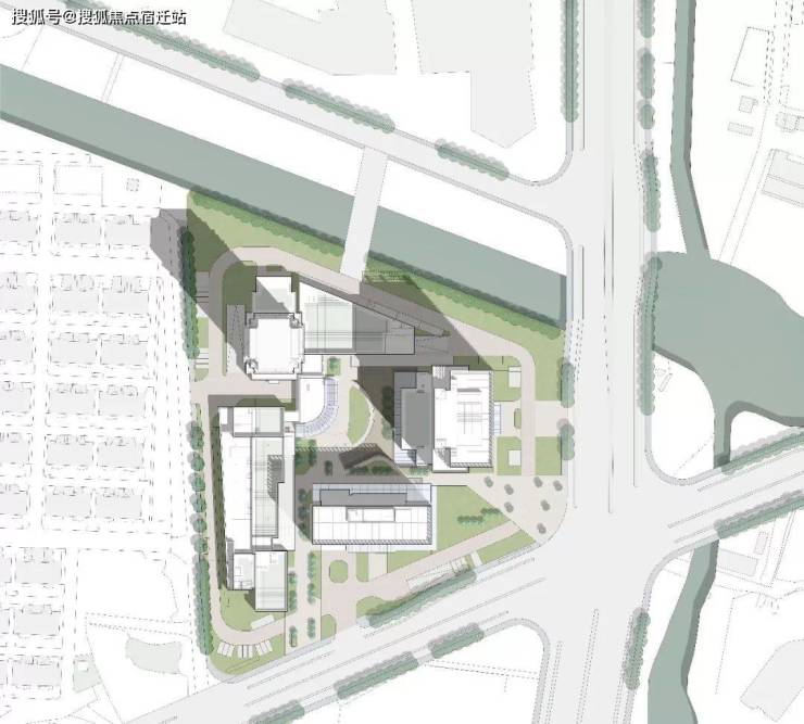 三幢高层建筑交错布局,构成一条贯通南北的轴线并与商业街动线串联,在用地中央形成一个具有活力的商业节点。商业街在次干道交叉口处、翁梅路以及沿河区域三个方向引入步行人流,并且在不同入口进行了差异化的形象设计。
