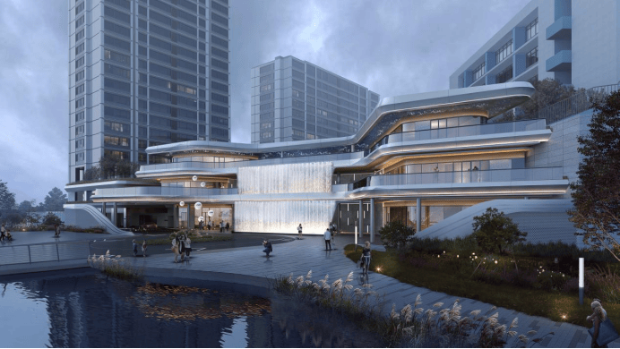 灰白对比的主色调,突出典雅的调性。保留宋式传统元素,并通过大面积玻璃、涂料、首二层石材+铝线条等简洁而现代手法,匹配现代品质生活。