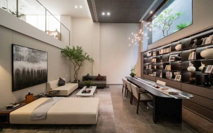 外立面,白色石材、香槟色的木纹铝板、大面积玻璃的拼接组合,怎么看都不像一个门槛只有400万+的低密叠墅。玉琮水景、山石跌水等等融入景观的大量良渚文明元素,弥漫着专属于杭州的千年气韵。满眼的“越级感”再配上只有1.2的超低容积率,最终才呈现出一座全低密真双叠大盘的样子。