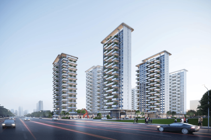 项目分为9幢23-26层住宅高层,及3栋商业和配套⽤房。