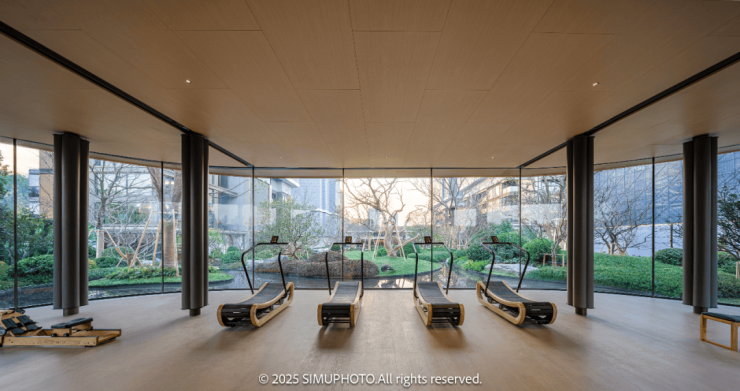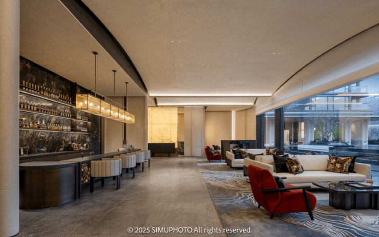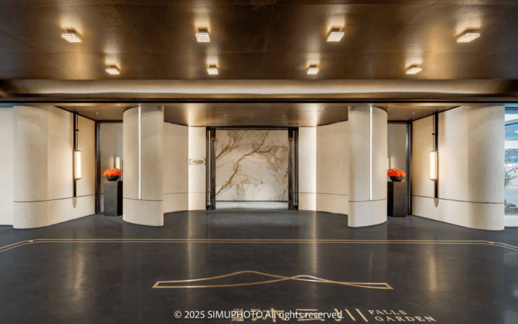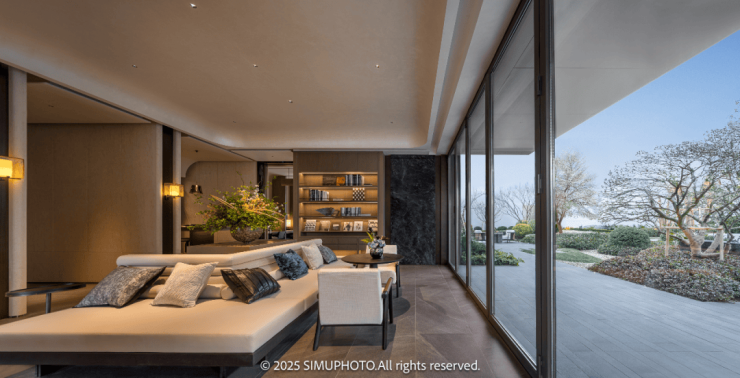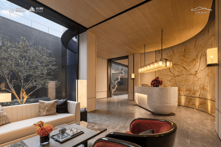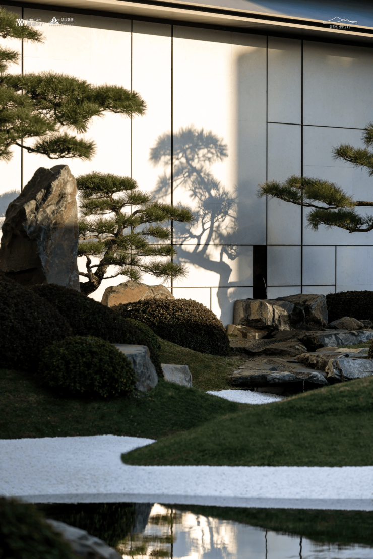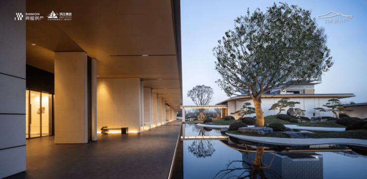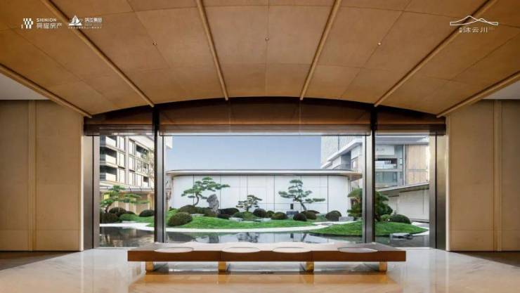 穿过大门,迎面而来的是拥有整幅落地玻璃的回家大堂“遇沐”,这里,曾于效果图中屡见不鲜的“足立美术馆”此刻犹如一幅徐徐展开的画卷,美不胜收地展现在眼前。
