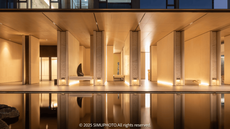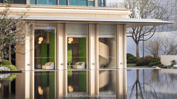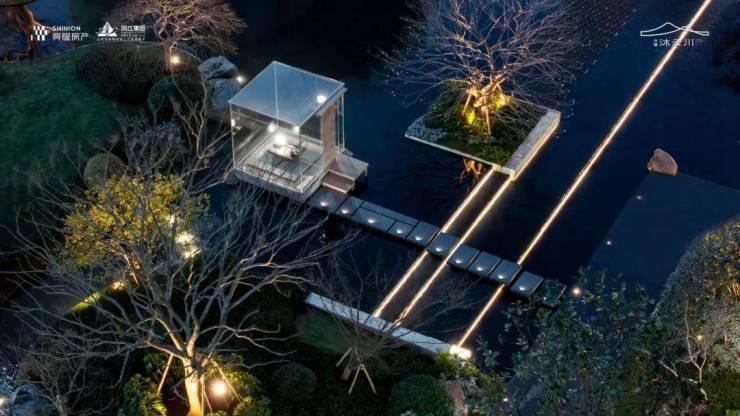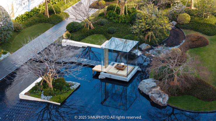 园区内精心规划了超过2200平方米的独特水景区域,让绝大多数楼幢享有推窗即可欣赏的优美水景。在这片宁静的水域之上,一座致敬艺术大师杉本博司的玻璃茶亭轻盈漂浮。其全透明的设计与周围的松林、茶丛、梅园相映成趣,共同构筑了一幅如梦如幻的画卷。人们称之为水上的“时空回廊”,仿佛漫步于水面之上,穿越历史的长河。