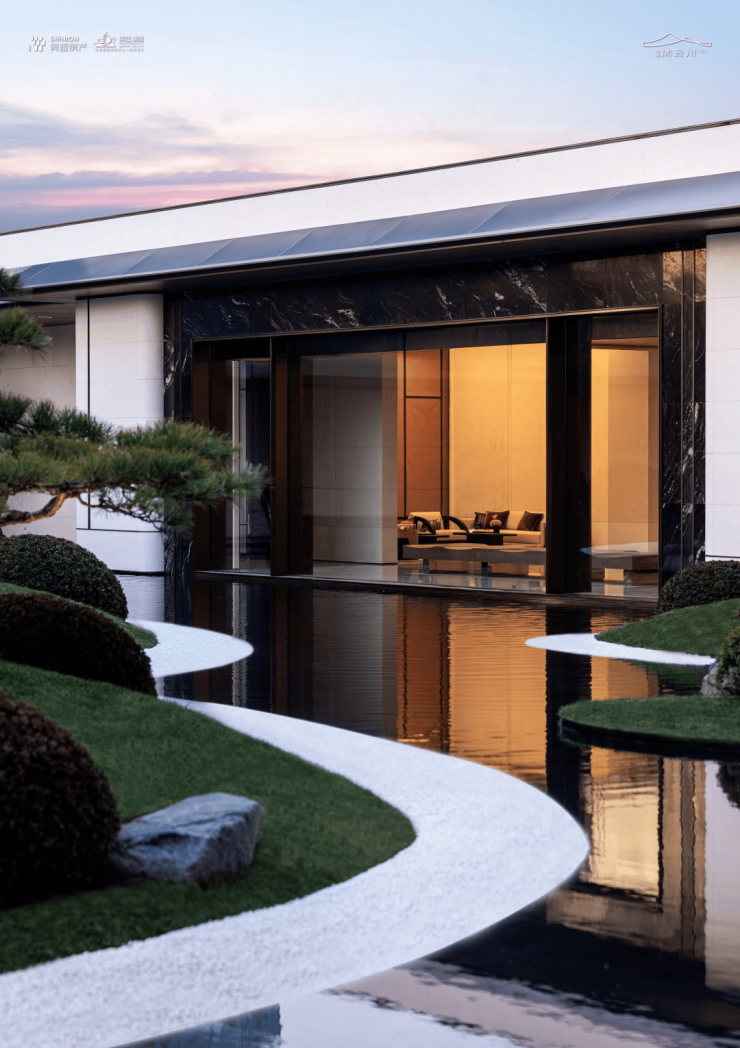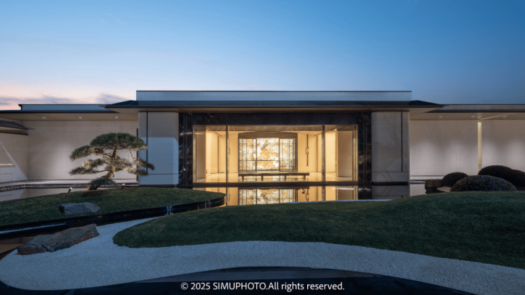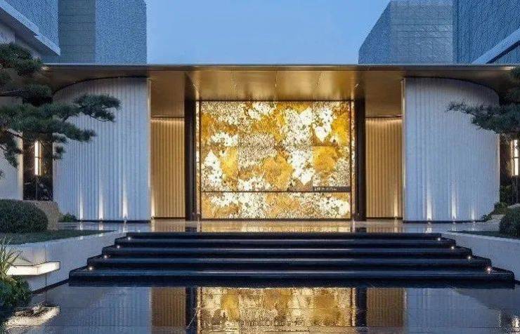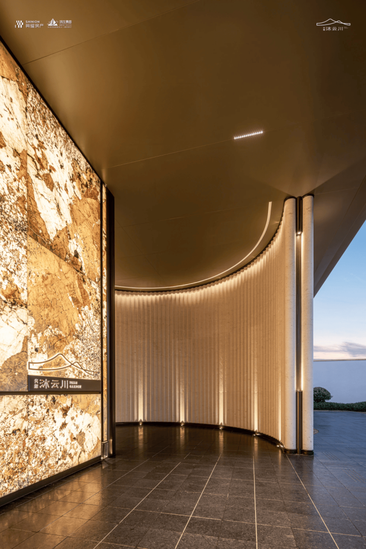 门头设计巧妙地将东方松画的意蕴与西方建筑的拱券立面相融汇,两侧挺立着四棵精选黑松,每棵价值高达数十万,彰显尊贵气息。中心照壁采用极致轻薄的大理石奢石镶嵌,柔和的暖光从中散发出温馨的氛围。两侧圆弧形的入户通道,既展现了西方简约风格,又蕴含了中国传统三进院落的内敛之美。