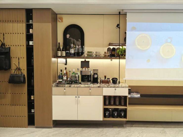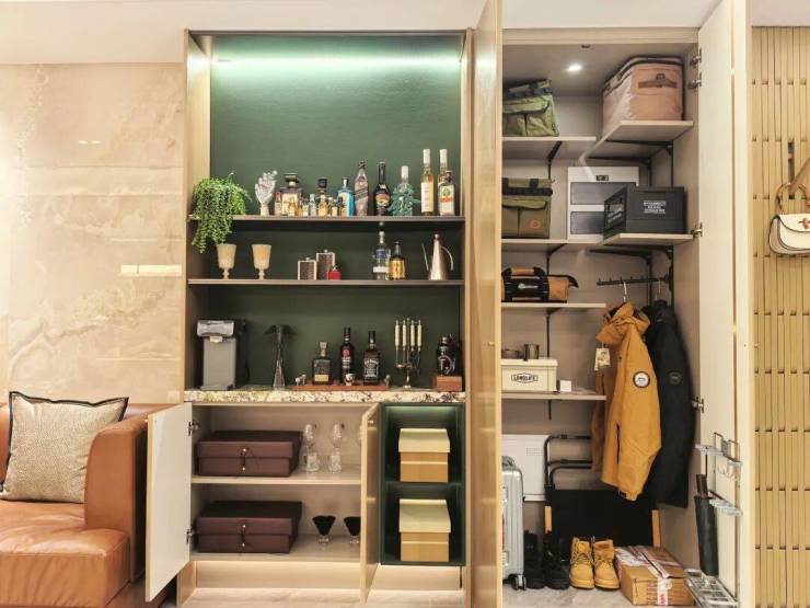 仔细看你会发现,他们在餐边柜旁还定制了一排整「零碎物品收纳柜」,可以储存零食和日用品,贴心满足日常收纳需求。