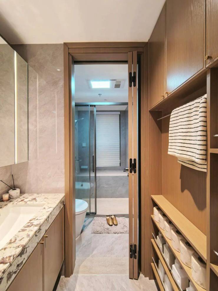 小户型卫生间收纳一直是行业难题,绿城将卫生间升级为折叠门,不仅进出更加方便,更在门背后增加了一整面「收纳薄柜」,这个独创设计被很多同行赞赏,估计很快会被学习。