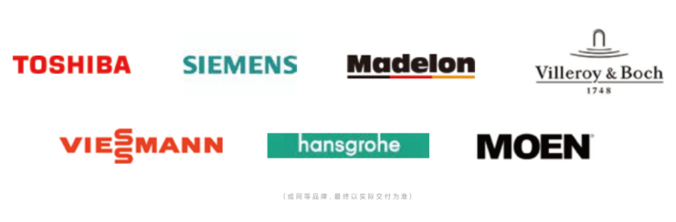 厨房是德国西门子油烟机、燃气灶、洗碗机,卫浴是德国唯宝洁具,汉斯格雅龙头、花洒,摩恩五金或同等品牌。