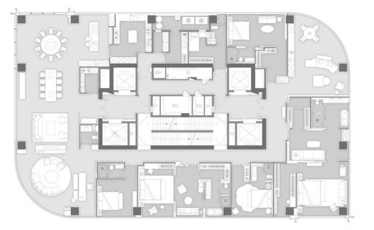 户型由GFD广飞设计事务所创始人叶飞亲力打造。五间豪华套房与三大公共空间的布局,能够满足每一位家庭成员的个性化需求。双重入户动线与私属门厅玄关,尽显归家的尊崇礼序。