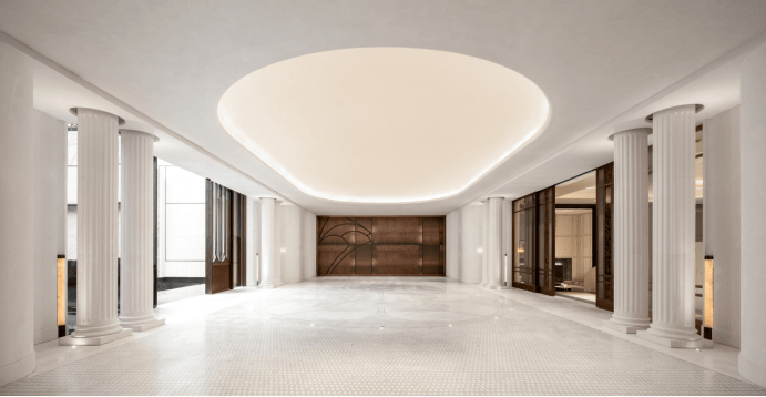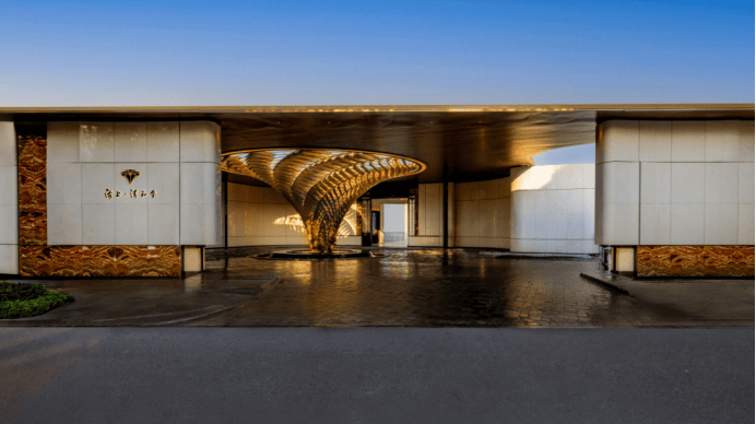 门庭延街的外立面,以精工定制弧形 米色石材 为主调,镶嵌典藏级 老虎玉大理石 ,点缀 古铜色现代海派艺术感灯器 ,整体呈现出百年海派的贵雅气质。