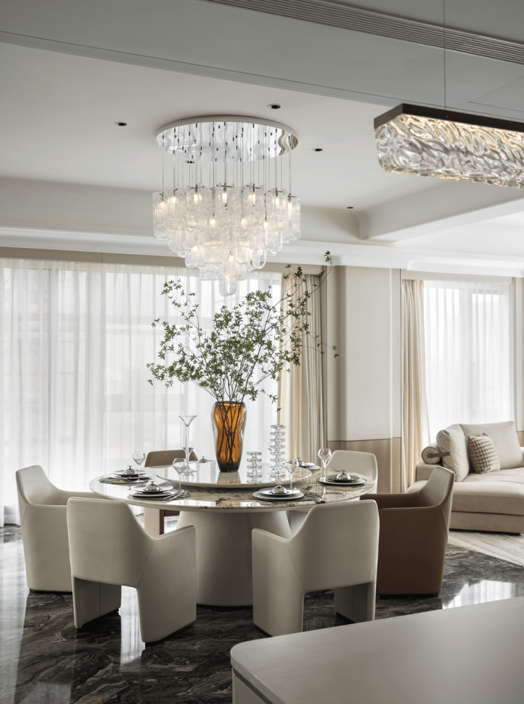 餐厅与客厅空间相贯连,开阔的视野带来惬意与更具互动感的用餐氛围。法国餐具品牌Christofle的精巧工艺与大理石水墨画般的自然纹理交相叠映,镜面光泽,熠熠生辉,每一处细节都彰显着对品质生活的极致追求。
