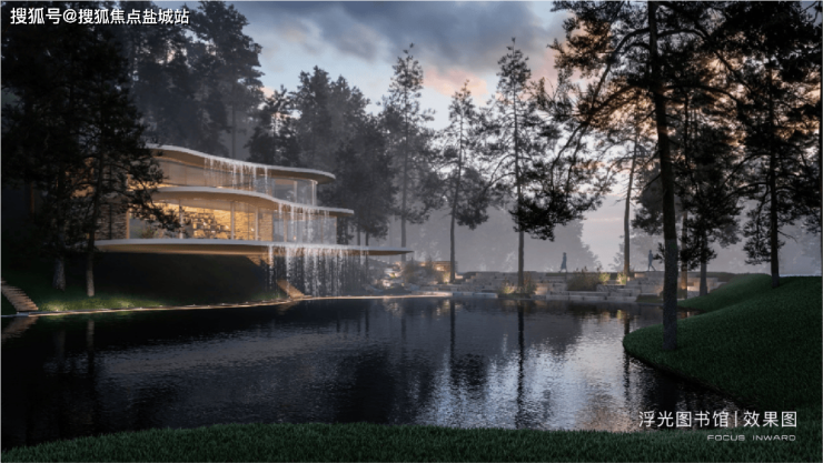 还有隐于湖边山体中的[浮光图书馆],整体以当代玻璃艺术建造,一道瀑帘流下,给人以豁然开朗之感;