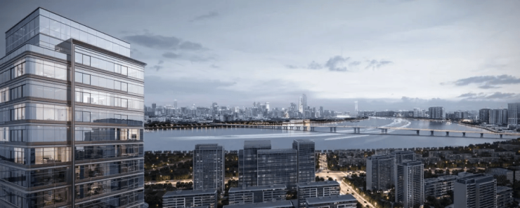 4幢现代高层建筑,遵循“无界共融”的设计理念,御钱湾仿佛原生于湾区土地之上。全面屏组合窗铝板幕墙,消隐建筑线条,闪耀着“晨曦金、江潮蓝、月光白”等自然变幻的色彩。