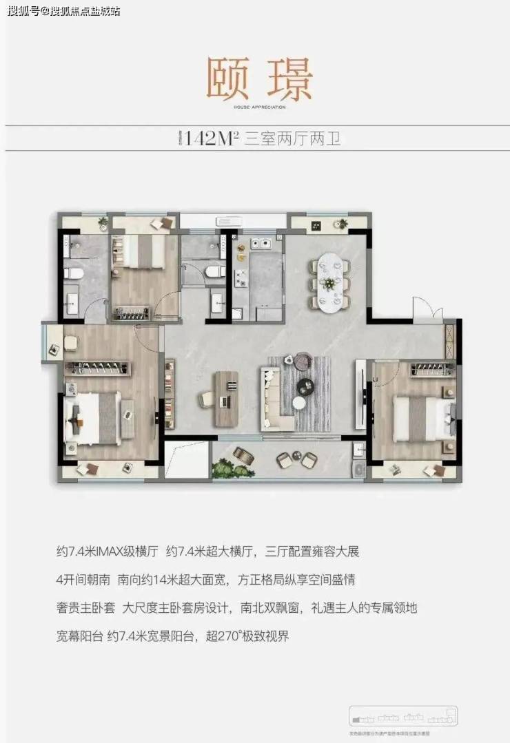 户型点评:两条天然河道从中建颐璟臺北侧和西侧蜿蜒流过,而140平这个户型最大的特点就是增加西侧开窗设计,整个房型三面采光,不但提升房间采光通风,更能完美拥有西侧北侧双河视野,一线河景尽收眼底;同时,约7.4米的大尺度横厅,除了拥有更大的采光面外,也可以根据需求自主隔离功能房空间。