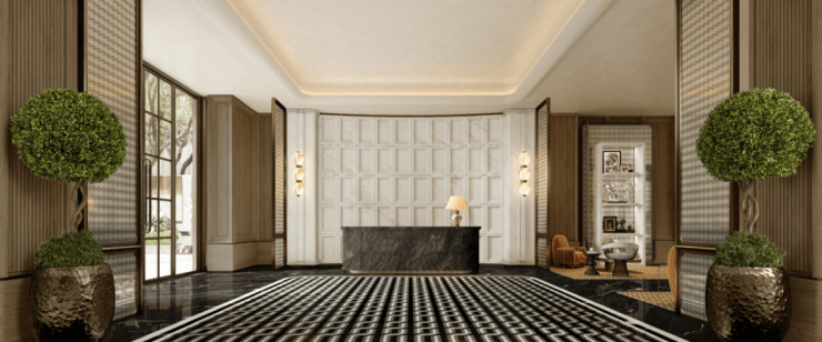 比如,挑高约6米的入户大堂、水系景观与艺术家共创作品交相辉映