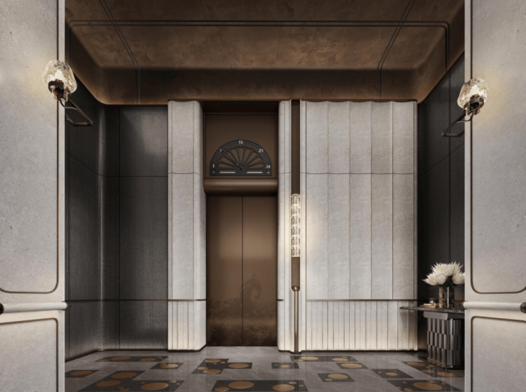 电梯厅的宠物识别按钮是艺术家定制款;入户门把手出自艺术家刘建华之手,用整块实心铜锭经锻造、打磨、电镀等多道精密工艺制成,握住的瞬间就是与艺术的触碰