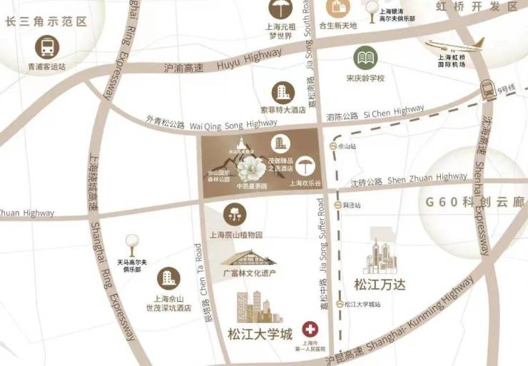 交通地铁:9号线洞泾站约3.2公里、佘山站约3.5公里;