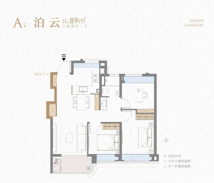 建面约89㎡三房:S墙设计+全飘窗,厨房带飘窗开创性扩容,约4.7米的客厅面宽,小户型亦有“成长性空间”。