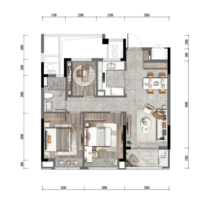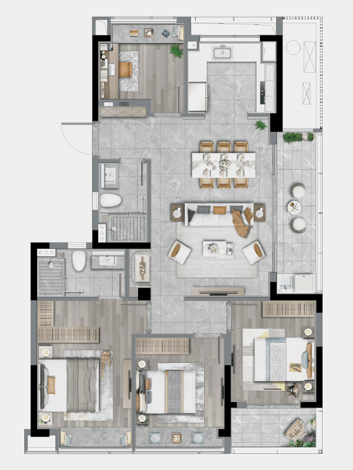 LDBK一体化的公区,充分实现了家庭成员间的互动;除了边厅外接的阳台外,南向次卧同样设计了阳台,兼顾了景观和晾晒的需求。