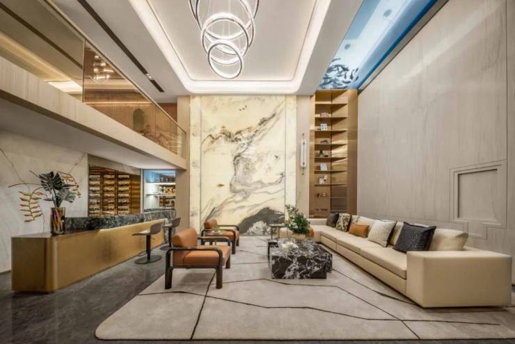 这个楼盘是一座山景低密项目,做了228套叠墅,48套洋房,整个小区的用材十分用心,门头两侧的石狮子,是由整块汉白玉雕刻而成。门廊内有一座锦鲤池,是项目的中心景观之一。锦鲤池旁,有整块的太湖石、黑松等价值不菲的景观装饰。