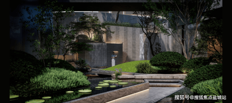 中央水韵庭院以「叠水莲池」为理念打造多层次的水景体系,叠水瀑布形成动态的水流韵律,池畔大理石打造的休憩长桌,成为被绿意环抱的林下空间,氛围相当惬意~