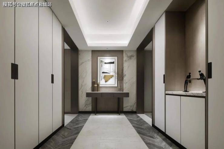 双开铸铝仿铜门+进口锁具;会客厅的地面是由意大利、巴西进口的名贵石材,卡拉拉白与保罗灰等石材作为装修主调。