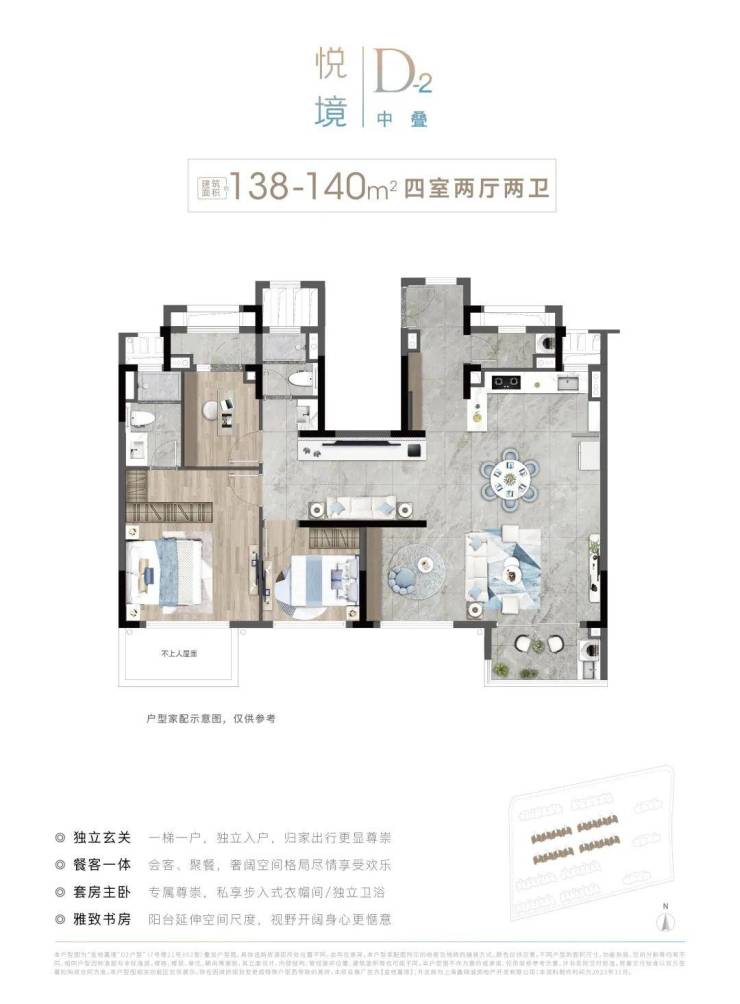 建面约 142m² 上叠,既实现了不同平层与普通高层的墅质体验,又简化传统别墅的复杂动线,以及频繁走动带来的不变,利用了空间,更能够科学地进行功能分区。
