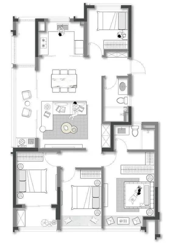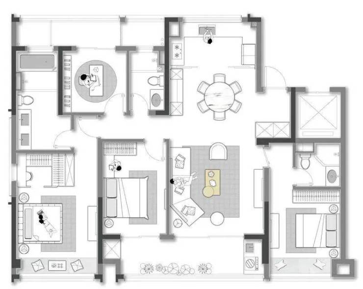 其中,172㎡户型为四房两厅三卫设计,四开间朝南,整体布局规整方正,客厅与西侧次卧联通大阳台,采光通透。双套房主卧设计,双飘窗,主卫双台盆,配浴缸;次卧套房采用隐形门,与电视背景墙相连通,保护隐私的同时又增加空间美感。