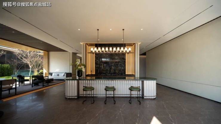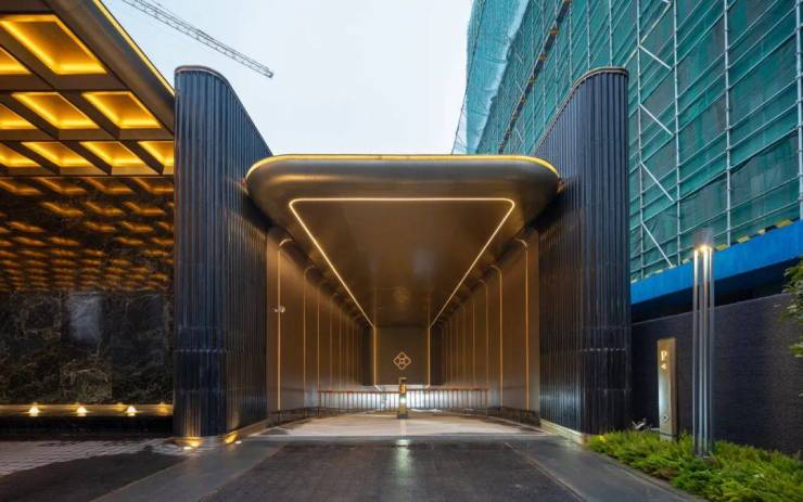 翠意流金的超50米宽、净高约6.45米的敞阔门庭,矗立一面艺术雕塑,在晚风中闪着荧荧微光,昭示着家的方向;沿着酒店式落客归来,中央迎宾水景、静水微澜与跌水如瀑交汇,塑造层层叠翠归家仪式,随之步入高奢酒店级大堂,铺展生活的序章。