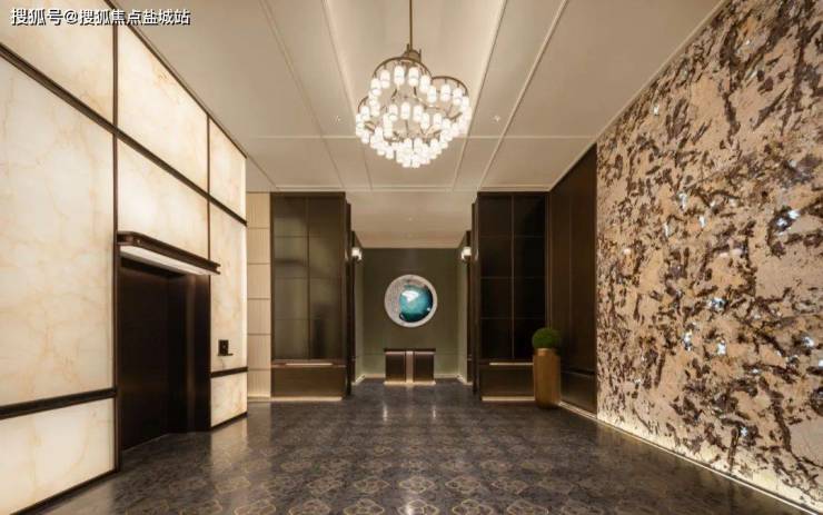 入口大堂地面通铺的是来自意大利的「范思哲黑」石材,这种石材不仅通铺在大堂的地面,还通铺到了楼梯,甚至通铺到了整个地下会所的空间。会所的电梯厅搭配一整面「雪山银狐」,地面用铜丝镶嵌LOGO。