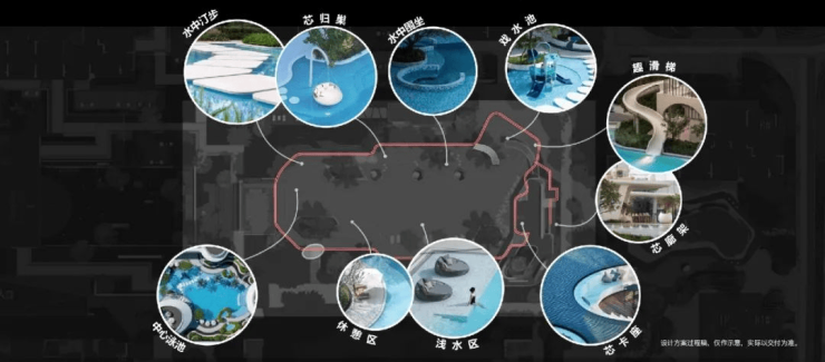 设计师以泰国芭提雅CROSS酒店泳池为原型,引入绿城“泳池综合区”理念,在约900㎡映翠泳芯,异形泳池为核芯,周边环以廊架、吊床、亲水吧台、草坪躺岛、水上滑梯等功能,由空间花园作为保障私密性的缓冲带;并以简洁的抽象形态打破传统空间规则感,实现艺术与生活的平衡,将无界泳池生活的畅想踏实落地。